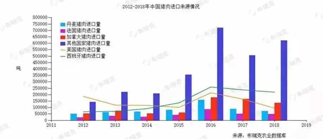 2012-2018年中国猪肉进口来源情况(布瑞克农业数据库)